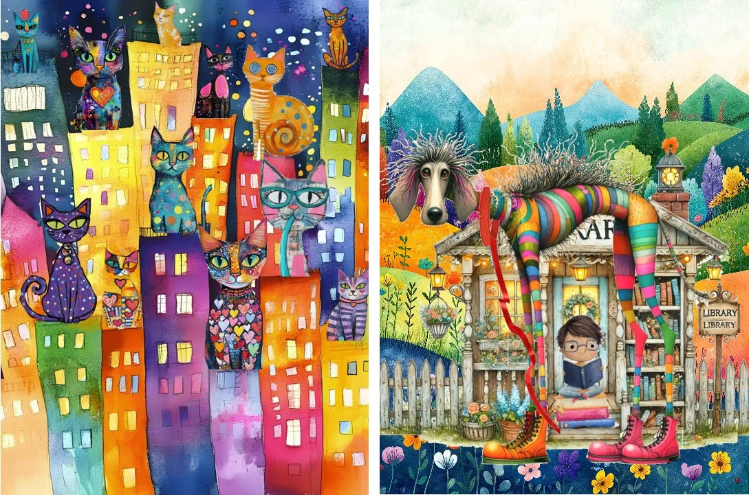Measuring 12” x 16,” the prints feature cats and dogs, bright colors, and zany images. Hanging on your walls, they’re certain to fascinate and relax pet owners.